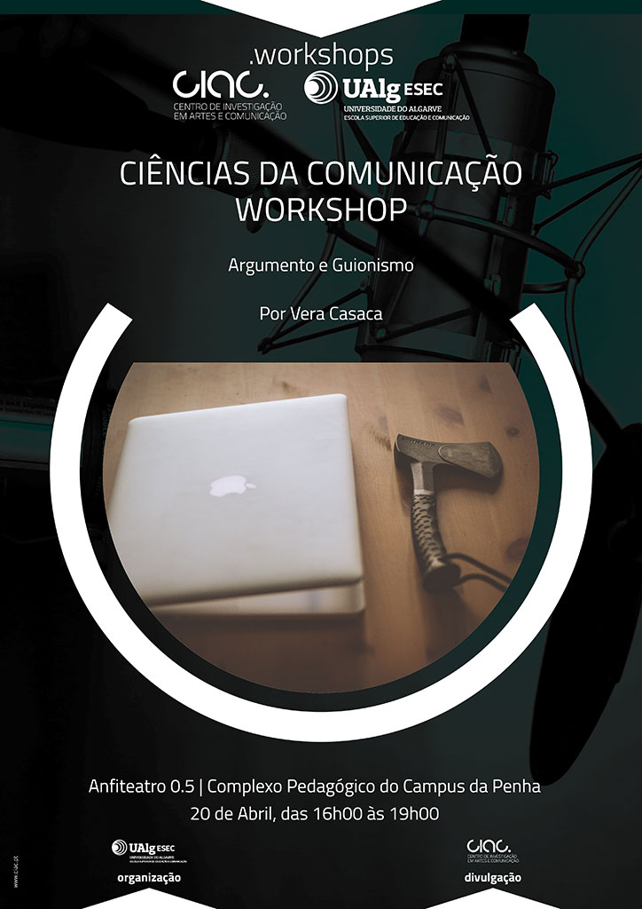 O Curso de Ciências da Comunicação da Escola Superior de Educação e Comunicação da Universidade do Algarve promove, na próxima sexta-feira, dia 20 de abril, com o apoio do Centro de Investigação em Artes e Comunicação, o workshop de Argumento e Guionismo com Vera Casaca, produtora e realizadora da Original Features.